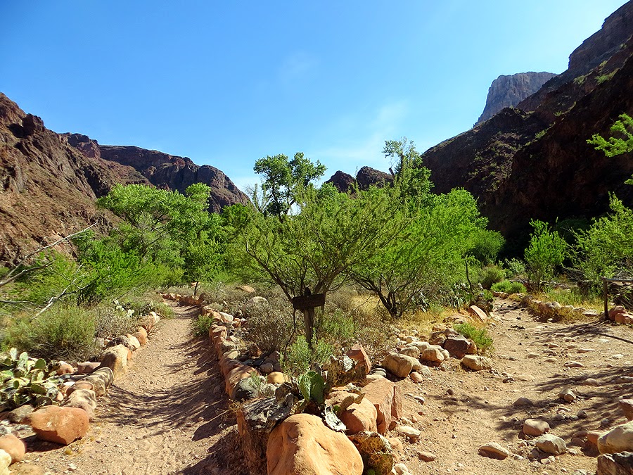 The Bright Angel Trail is mostly level as it heads around the lower canyon cliff walls